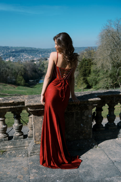 Turn heads in the Selene Couture Style 1342 Red Jersey Shiny Sparkle Gown, a glamorous, fitted evening and prom dress designed for modern elegance. Crafted from shimmering jersey fabric, this dazzling gown features a structured corset bodice with delicate spaghetti straps, a sultry thigh-high slit, and an elegant lace-up back for a perfect fit. Ideal for prom, black-tie events, and formal evenings, this sparkling red gown combines timeless sophistication with show-stopping allure.